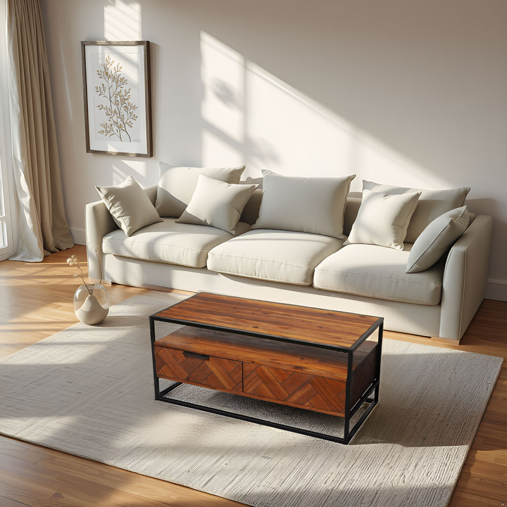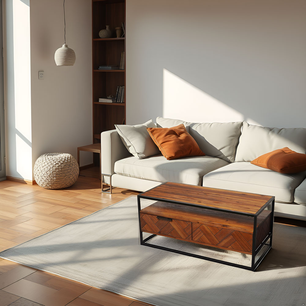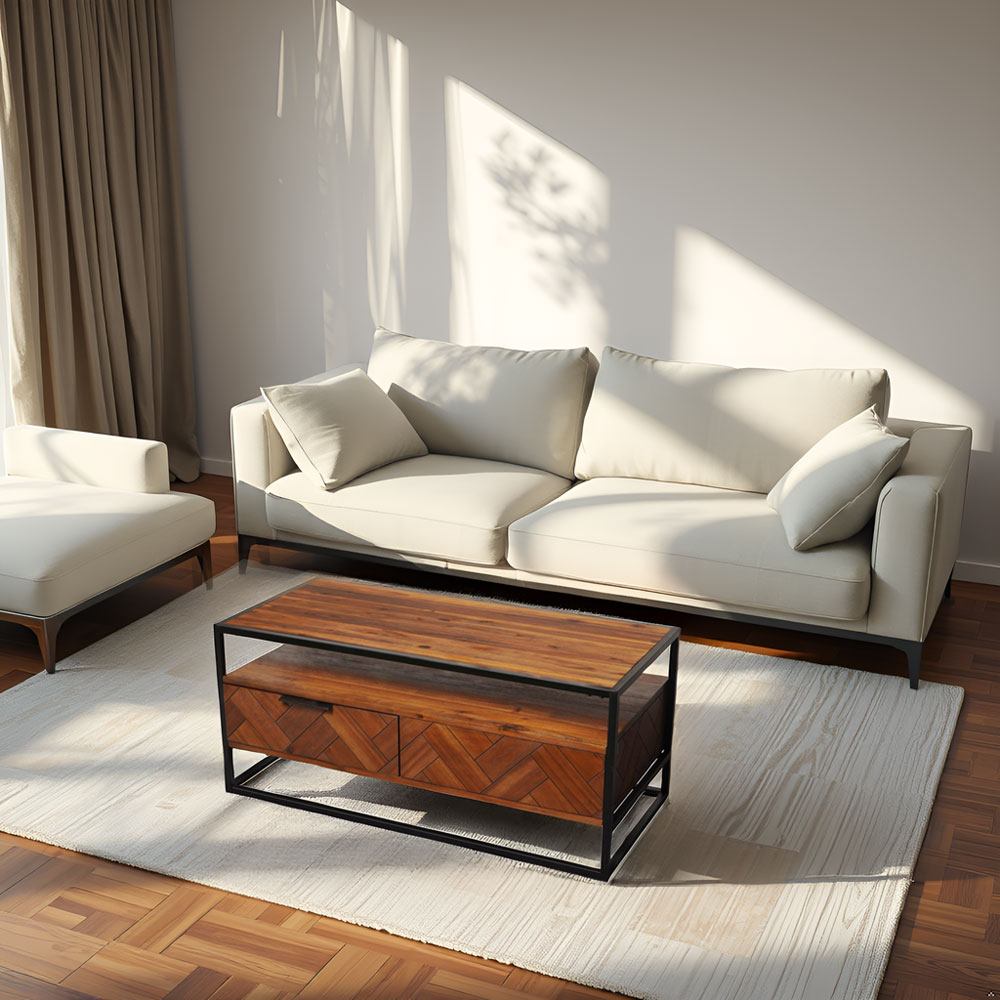 Bring warmth, function, and modern character into your living space with this beautifully crafted acacia wood coffee table. Designed with a durable pine-veneer exterior and supported by a sturdy powder-coated steel frame, this table blends natural texture with industrial elegance for a timeless look that fits effortlessly into contemporary, rustic, or minimalist interiors.