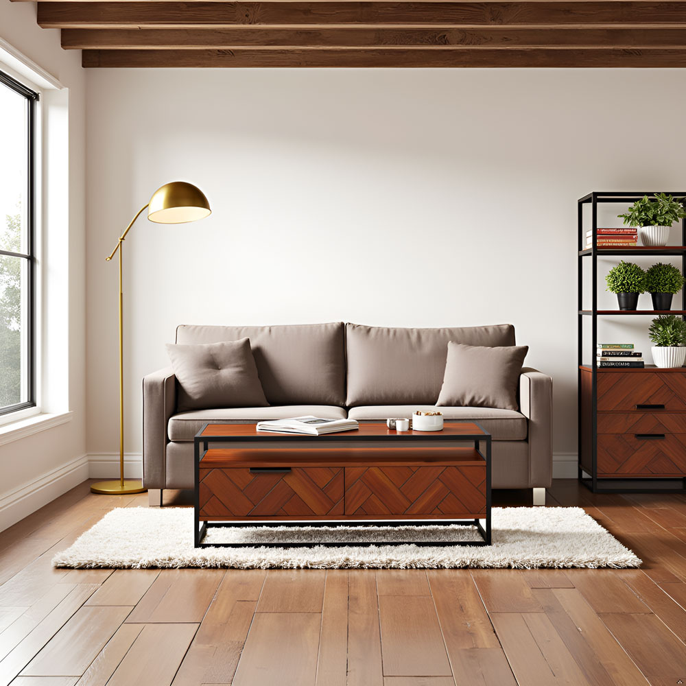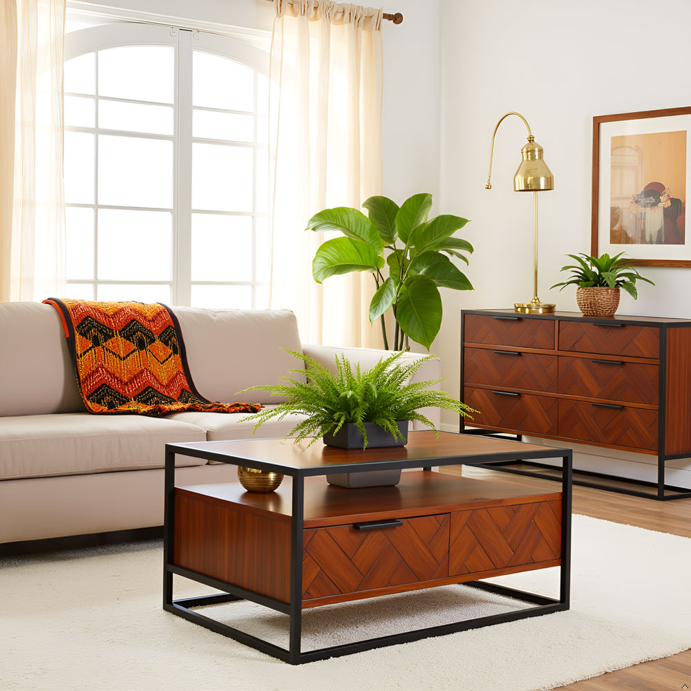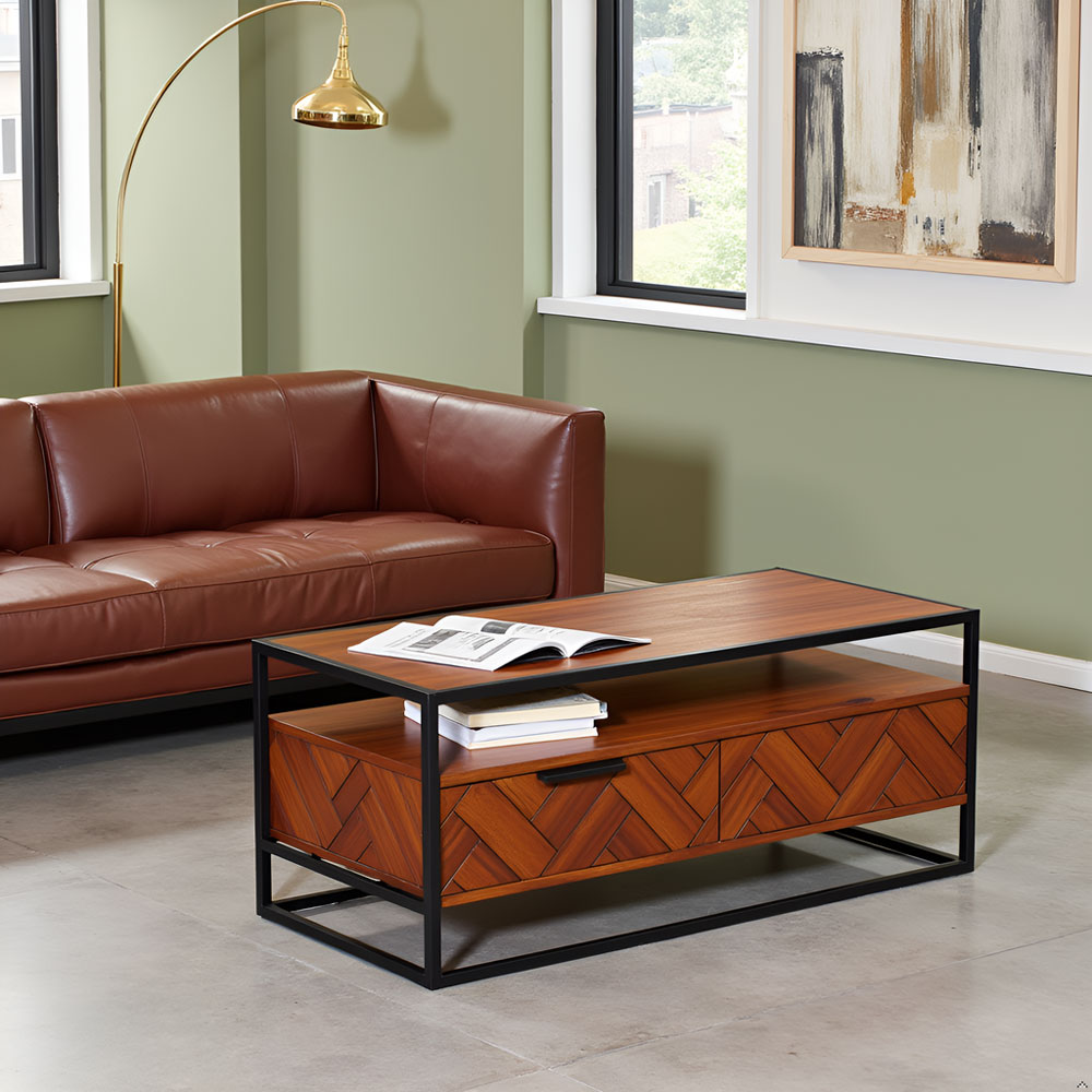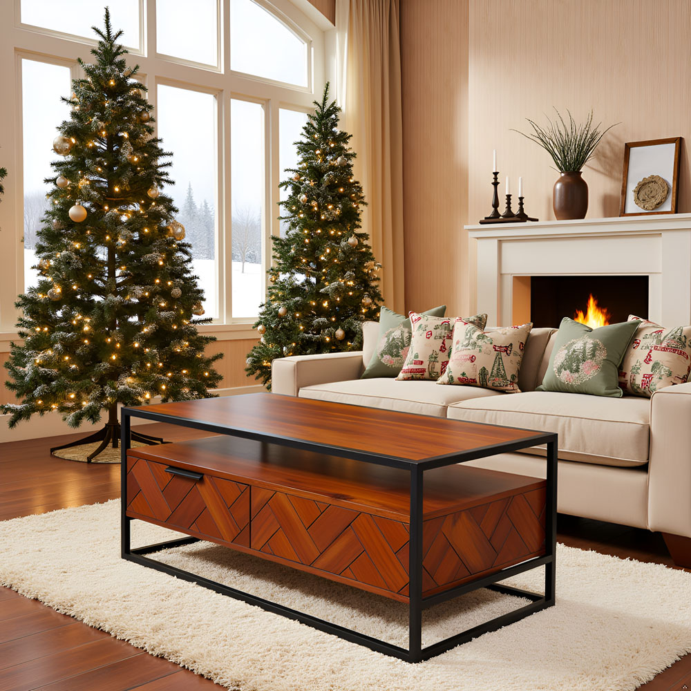 Bring warmth, function, and modern character into your living space with this beautifully crafted acacia wood coffee table. Designed with a durable pine-veneer exterior and supported by a sturdy powder-coated steel frame, this table blends natural texture with industrial elegance for a timeless look that fits effortlessly into contemporary, rustic, or minimalist interiors.